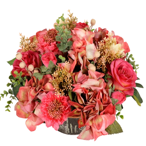 Kunstbloemen biedermeier in de kleuren roze en cerise. Door lokale bloemist gemaakt en bezorgt in heel Nederland. Handwerk zijn deze kunstbloem bloemstukken