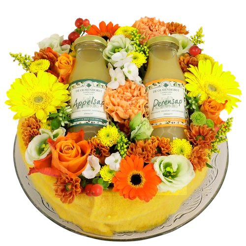 Een vrolijke bloementaart in de oranje gele tinten. Zo neer te zetten. Bestel bloemen online bij BoeketCadeau.nl