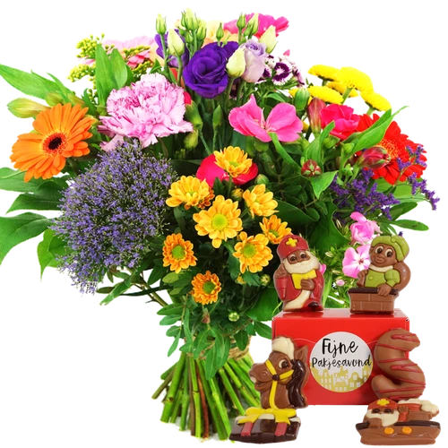 Een vrolijk boeket bloemen samen bezorgt met heerlijk Sinterklaas chocolade. Bestel op tijd. Op = op! Thuiswinkel lid.