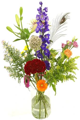 Een verzameling van bonte bloemen inclusief glazen vaas kant en klaar opgemaakt en bezorgd in heel Nederland. Thuiswinkel Lid. Kies uw eigen bezorgdatum.