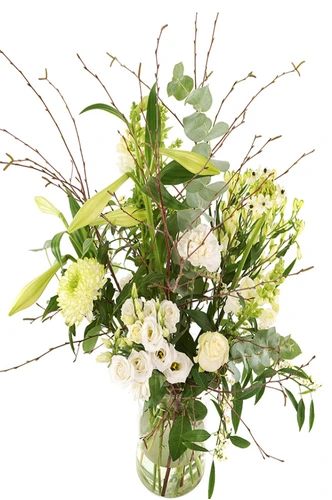 Witte bloemen zo geplukt en opgemaakt in een glazen melkbus vaas. Compleet bezorgd met glazen vaas aan huis of bedrijf, ziekenhuis, etc. Versgarantie en Thuiswinkel Lid