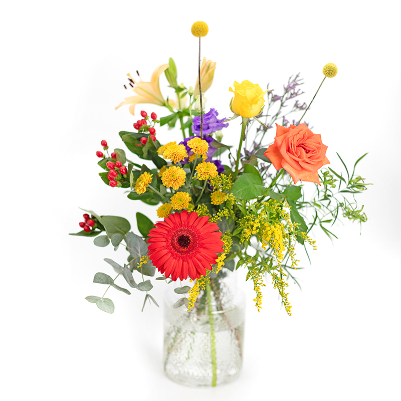 Zeg vaarwel tegen saaie momenten met Golden Hour, een boeket dat aanvoelt als pure zonneschijn! Met stralend gele lelies, oranje rozen en rode gerbera’s geeft dit boeket een warme uitstraling aan elke ruimte of gelegenheid. Of je nu een speciaal moment viert of gewoon wat vrolijkheid wilt sturen, dit arrangement doet het in stijl. De bloemen worden in knop geleverd, zodat ze mooi zullen bloeien en elke dag een beetje specialer maken. Met bloemen die lang meegaan geef je bovendien een cadeau dat blijft stralen, waardoor het een mooie en slimme keuze is voor elk budget!