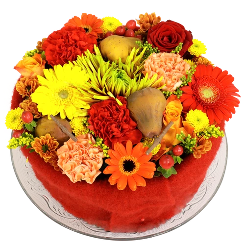 Een taart van bloemen in de herfst kleuren. Oranje, rode en gele herfst kleuren voeren hier de boventoon in de bloementaart.