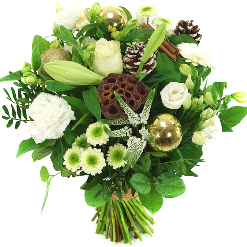 Kerst bloemen, traditioneel klassiek wit kerstboeket met kerst materialen. Bestel eenvoudig en op tijd. Thuiswinkel Lid.