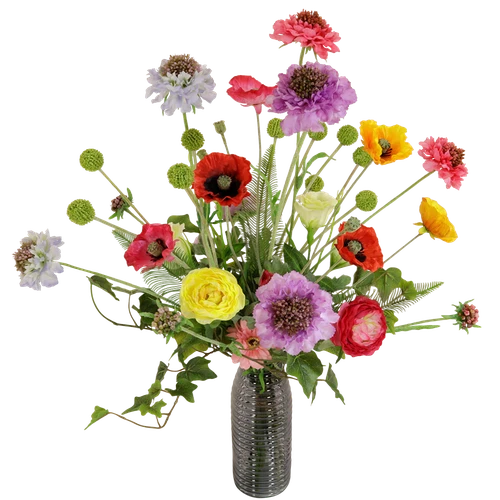 Een kunstbloemen boeket bestaande uit veldbloemen, helemaal van deze tijd. Hoog laag geranggeschikt. Brengt veel vrolijkheid in huis dit kunstboeket bloemen