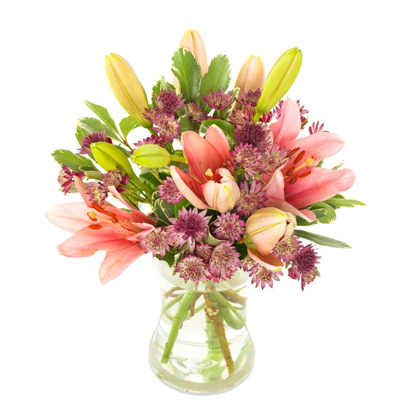 Een sterk en stralend boeket met deze kleurrijke roze lelies en paarse astrantia: symbolen van kracht en moed. Grote emoties met een klein prijskaartje.
