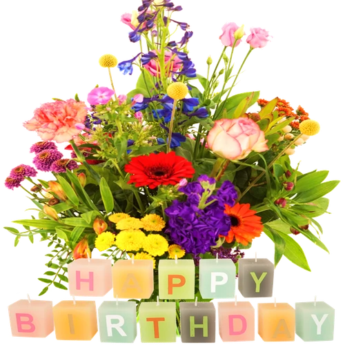 Plukboeket bloemen voor een verjaardag met 13 kaarsjes in glas met de tekst er op ” HAPPY BIRTHDAY ” Bestel dit unieke cadeau. 24/7 bezorgd in heel Nederland.