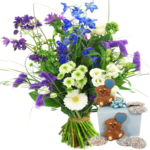 Geboorte boeket bloemen voor een jongetje en heerlijke geboorte chocolade een mooie combi deal voor een pas geboren jongetje. Thuiswinkel Lid.