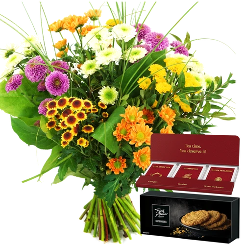 Boeket bloemen met koekjes en Thee samen bezorgd.