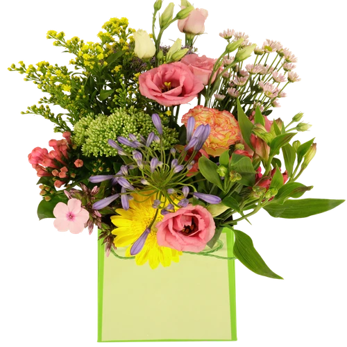 Boeket bloemen in een tasje compleet geleverd om zo neer te zetten in huis. Bestel vandaag nog! Thuiswinkel Lid.