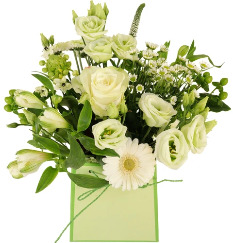 Verse witte winter bloemen opgemaakt in een tasje, geheel compleet om cadeau te geven. Bestel vandaag nog dit winter tasje bloemen en geef deze cadeau.