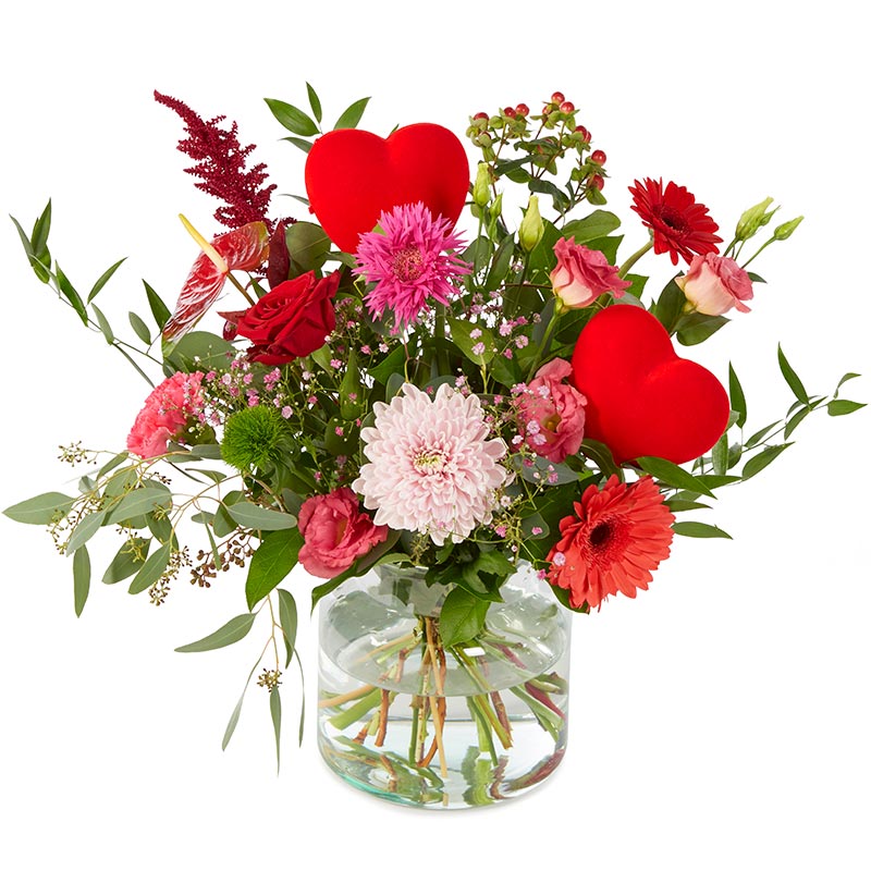 Een prachtig boeket, perfect als romantisch cadeau tijdens Valentijnsdag. Bevat amaranthus, lisianthus, anjers, chrysanten, gerbera’s en meer. Afgewerkt met een rood hartje. Vaas niet inbegrepen.