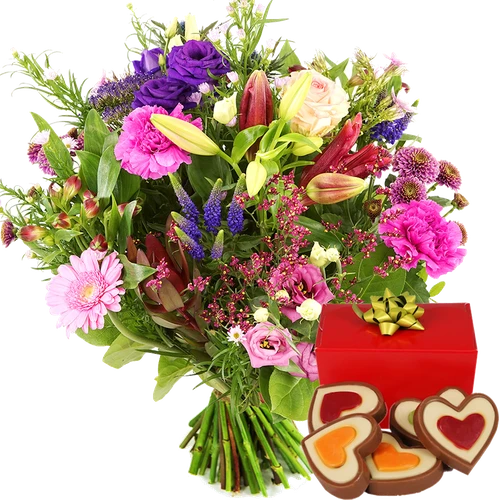 Veld gelukte bloemen in de roze en paarse kleuren de bloemen zijn springerig gerangschikt samen bezorgd met heerlijke hartjes chocolade. Versgarantie. Thuiswinkel Lid.