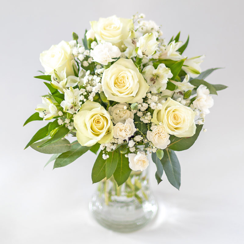 Witte rozen, alstroemeria en anjers creëren dit stijlvolle en tijdloze arrangement dat pure schoonheid uitstraalt. Samengesteld uit een betoverende mix van witte bloemen en vers groen, biedt dit boeket elegantie dat geen fortuin kost. Dit boeket wordt verzonden in een speciale doos van Euroflorist om de stelen tijdens het vervoer te beschermen. Met water en onze bijgeleverde bloemenvoeding zullen de zachte bloemen binnen twee dagen hun magie onthullen en een adembenemende verrassing zijn voor je geliefde. Bovendien kun je de bezorging op de voet volgen met Track&Trace, zodat je helemaal gerust kunt zijn. Geniet van voordelige bloemen zonder in te leveren op kwaliteit met dit prachtige boeket van witte rozen, alstroemeria en anjers. Deze witte compositie zal zeker een blijvende indruk achterlaten en hoeft niet duur te zijn.