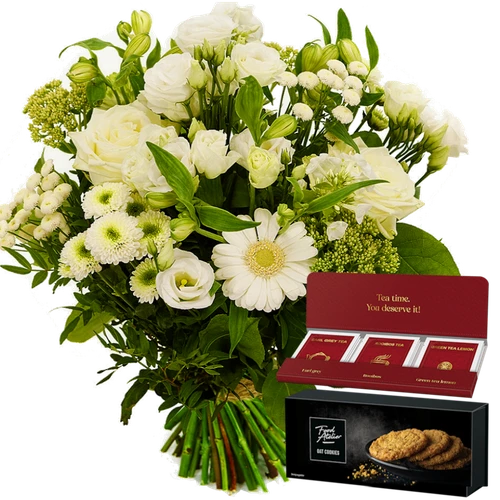 BoeketCadeau.nl biedt een prachtig witte bloemen geschenk, een wit boeket met koekjes en thee rechtstreeks samen bezorgd aan de deur.