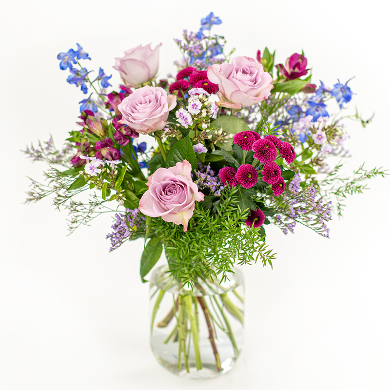 Zeg het zachtjes, maar zeg het met bloemen. Deze tedere mix van lila, roze en blauw straalt rust en romantiek uit. Ideaal als lief gebaar, zomaar of voor een speciale gelegenheid.