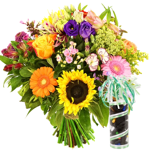 Verse bloemen voor Vaderdag en een koker met gemengde drop samen bezorgd voor Vaderdag in een luxe geschenkdoos.